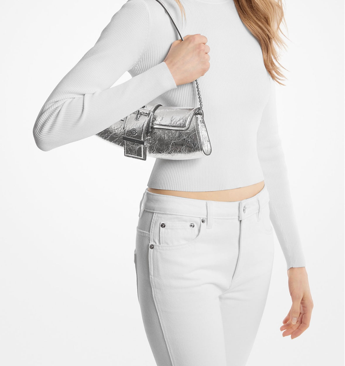 Aunque pequeño, el clutch convertible Colby tiene un estilo impactante. Presenta una atemporal forma baguette en cuero metalizado craquelado, con parte superior plegable y hebilla extragrande. Llévalo al hombro o desmonta la correa para llevarlo en la mano. • 100 % cuero de curtidurías que cumplen con los más altos estándares de desempeño ambiental